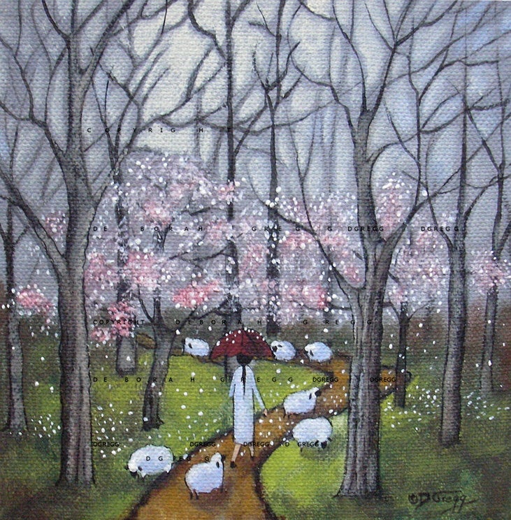 The shepherdess and her little flock always cut through the forest to the grassy pasture. And spring time, with new life changing the look of it daily, is magic. Today the dogwoods are just starting to let go of their beautiful petals. A misty rain is falling but the clouds are breaking. In a bit the sun will shine as her and her group of sheep are already, from the inside out. :0)“To see a hillside white with dogwood bloom is to know a particular ecstasy of beauty, but to walk the gray Winter woods and find the buds which will resurrect that beauty in another May is to partake of continuity.” ~Hal Borland